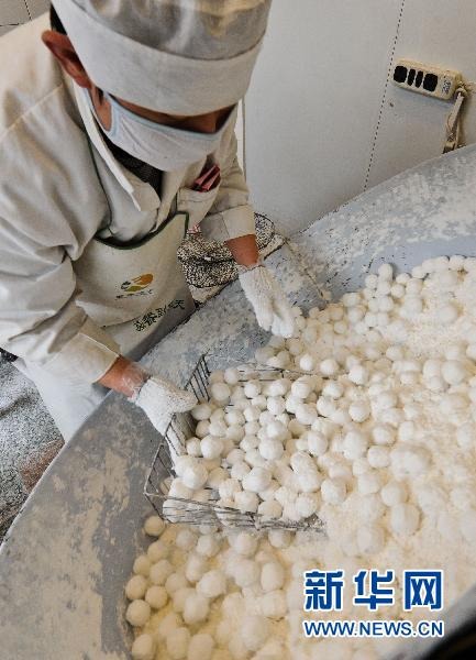 将核桃仁、金糕丁与面粉、白糖、瓜子仁一起放入盆中加入适量凉水拌成馅,再制成五分见方的馅块,放在通风处晾二十四小时。将馅块过凉水,放入糯米面中滚动,再在凉水中蘸一下放入糯米面中滚动,如此四到六次,使糯米面全都沾在馅块上,并且表面圆滑,磕碰不裂,即成元宵。
