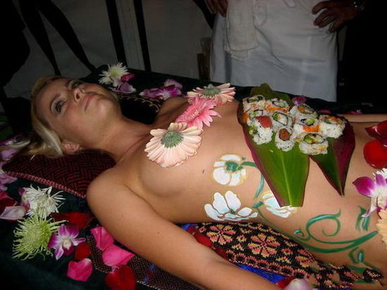 “女体盛”的胸部摆放着裱花奶油蛋糕,好像穿着美丽的文胸,漂亮极了。传统的在“女体盛”身上摆放寿司有讲究,根据每种寿司的滋味补作用摆放在女体盛身体的特定部位。