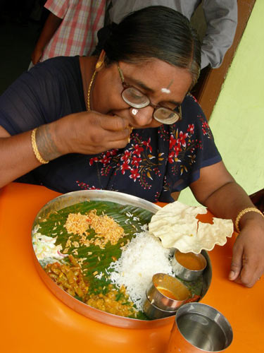 每人面前摆放一个大盘子,把米饭盛上,再浇上菜和汤,然后用手稍加混合,捏成团,就抓着送进嘴里。在街头的小吃摊、小吃店以及寺庙里,人们通常用一种干树叶压制成的盘子来盛食物,有的餐馆则给每个吃饭的人一片新鲜的大树叶子,用来盛米饭等食物,这倒是很环保。