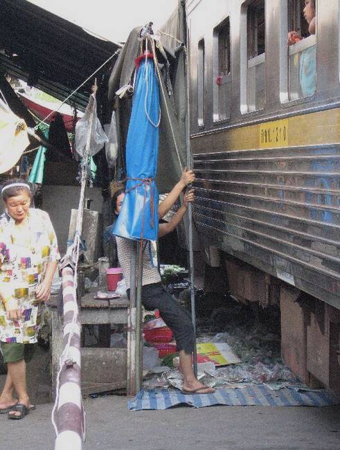火车来了,黄色车头拖着破旧火车正缓慢驶来,铁轨上甚至没有枕木,其两旁货摊的老板急忙收起遮蔽在铁轨上方的顶篷。