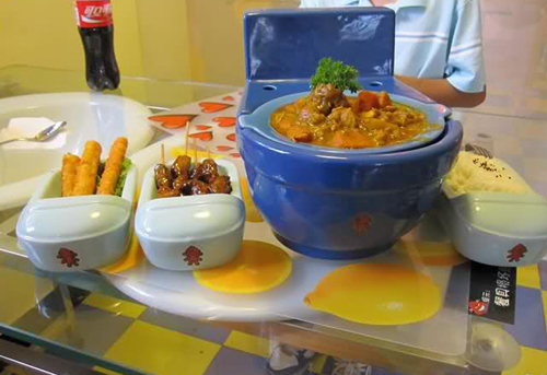 餐厅的整个装饰都是按照卫生间的样式设计的,货真价实的马桶椅子,缩小版的马桶和便盆成餐具,干干净净的墙上画着各式“便便漫画”,真不知是进入了五星级厕所,还是进入了餐厅。而上来的食物也着实让人吃惊不小,逼真的效果可能会将胆小的您给吓跑了,在配上另类的吓人菜品,让您在视觉和听觉上的先入为主,而对美食有所却步。