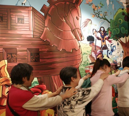 闭上眼睛,打开心灵,体会黑暗中的奇妙。“木马童话”餐厅的名字取自西方的著名传说《特洛伊木马》,来此的食客彷佛化身为骁勇的古希腊勇士,置身幽暗而巨大的木马腹中,开始一场神秘、奇妙的美食旅程。餐厅的大门处,一幅色彩浓烈的巨幅壁画迎面而来,这是老板的朋友为餐厅特别创作的。