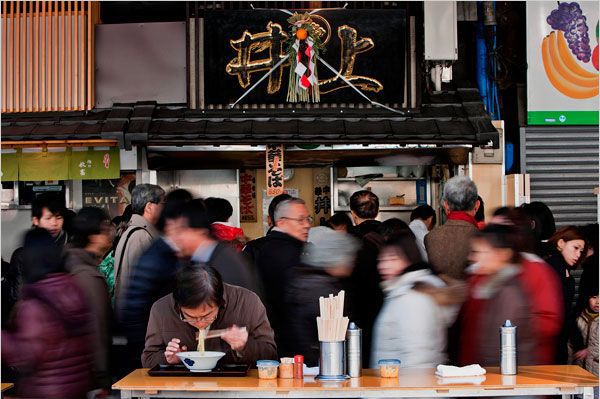 井上酱油拉面摊点离筑地鱼市仅仅一街之隔。在筑地鱼市市场通常游客都会大掏腰包购买寿司。