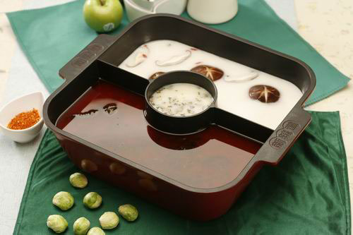 这种特制锅底是专门搭配两段鱼或者海鲽鱼一起食用的。两段鱼是美国叉尾鮰鱼鱼翅和加吉鱼鱼脯,这两种鱼都具有肉质肥美、爽滑无刺的特点。涮在锅中还可以增加汤的鲜美。
