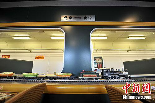 广西南宁一家餐厅以火车为主题,部分座椅装饰在“火车车厢”内,铺设的轨道贯穿整个餐厅,一列小火车运输菜品马不停蹄地在餐厅内驰骋。