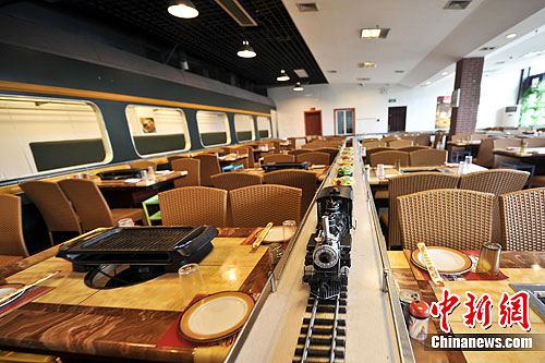 3月26日,广西南宁火车主题餐厅内忙碌的小火车。洪坚鹏摄