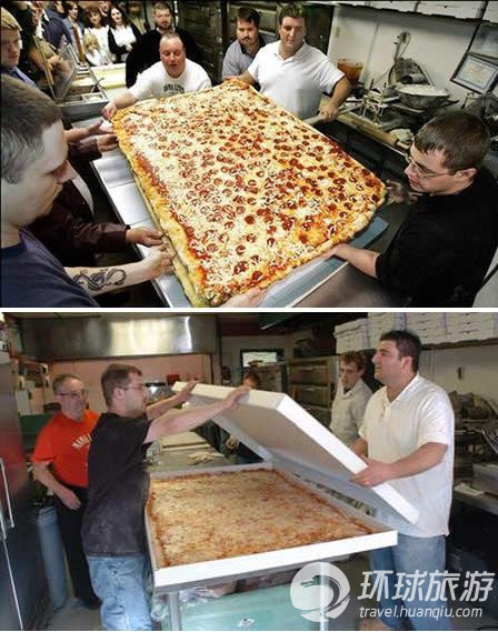 这是世界上最大的出售大号披萨的店,图中的这个披萨长55英寸,宽37英寸。做这样一个披萨需要10.10磅奶酪、14.97磅面团、8.26磅沙司,需要烤20分钟。这个大号披萨售价99.99美元。