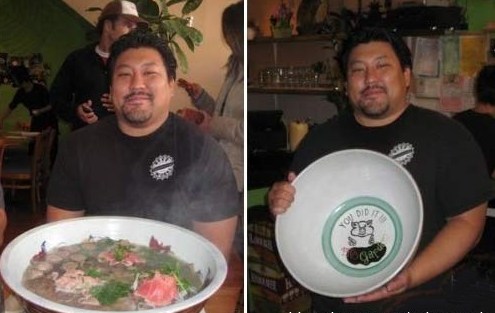 你也许很爱吃面条,但如此超级加大碗拉面,你能在60分钟内吃的一干二净吗?这是美国旧金山PHO GARDEN 面馆推出的Super XXL 越南拉面,只要你挑战成功,在规定的时间内吃完整碗面,就会看到碗底的祝贺成功的文字“你做到了!(You Did It!!!)”,而且店主人还会把你的获胜照片挂在墙上展示。不过对于大多数不能完成此“不可能完成的任务”的人,只能是高挂“我投降(I Surrender)”的白旗。