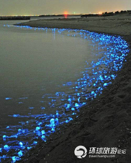 日本富山湾(Toyama Bay)每年3月左右,都会被一片奇异的蓝色荧光覆盖。它们就是荧光乌贼(又称萤火鱿) (Firefly Squid),生活在西太平洋里的神秘生物,藉由特殊的身体外膜,这些乌贼吸收月光,转化成眩目的冷光蓝来吸引猎物。