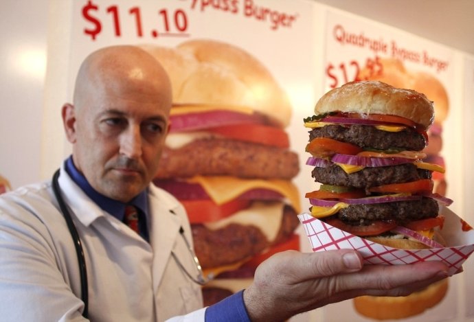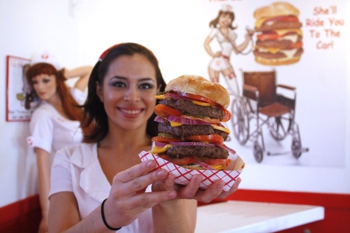 这里的主要快餐就是汉堡,分别叫做”Single(一层)”, “Double(两层)”, “Triple(三层)”,还有“Quadruple Bypass(心脏搭桥)”,其中的心脏搭桥汉堡包括了两磅的牛肉, 4层的奶酪和12片熏肉,它所含的热量超过了8000卡路里。