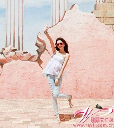 白色棉质抹胸上衣搭配浅色系破洞牛仔裤和白色平底凉鞋