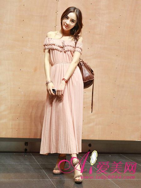 一字娃娃领宫廷风长裙超级美,和谐的裸粉色怎么看怎么喜欢,然后稍稍露出小香肩,性感。