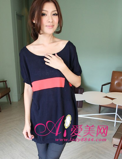 深色色调显瘦效果很是明显,胸前的红色撞色拼接十分抢眼。针织面料在夏天穿不会太过憋闷,蝙蝠袖袖口遮挡手臂赘肉,大圆领的设计更是凸显肩颈的线条。