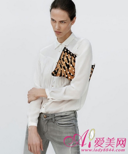 白色流苏衬衫 + 虎纹手包 + 牛仔裤