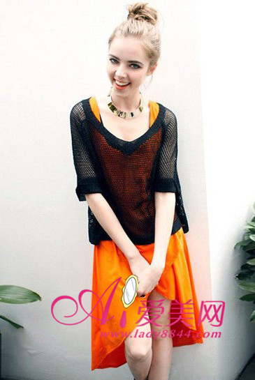下摆的交叉设计配上亮丽动人的橘色色调充满夏日的朝气感,外搭一件大桃领黑色镂空罩衫,俏皮可爱!