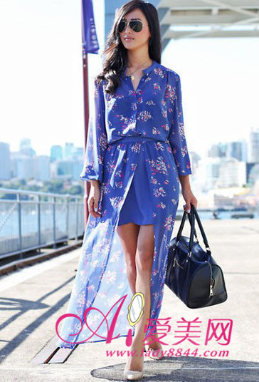 衬衫款式带点女生深藏的帅气感,里外两层不规则的裙摆更显夏日的慵懒感。高贵的宝蓝色在小碎花的衬托下更显气质。