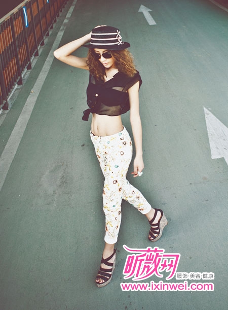 用花朵图案装饰紧身裤在酷感造型中增添甜美味道