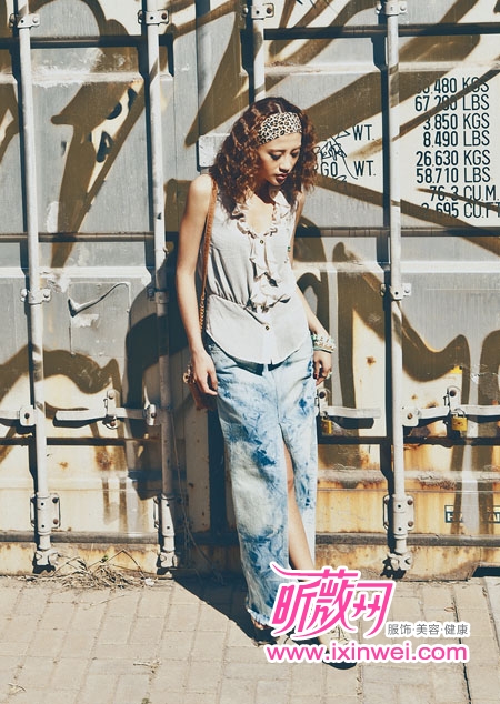 高开叉牛仔长裙搭配略带甜美的雪纺衬衫展现成熟魅力