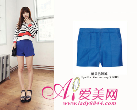 每到夏天,糖果色便大行其道,跳跃活泼的色彩让人活力四射。这款短裤不仅完美的展示了腿部线条,更大胆运用鲜艳的色彩将人的视线全部转移到腿部,修饰了上身的小缺点,非常适合腿形好的MM穿着。