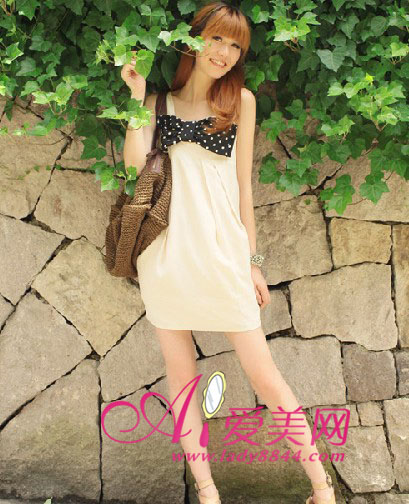 大大的波点蝴蝶结是整条裙子的亮点设计之一,小性感的吊带款式让mm露出白皙肌肤,腰身的褶皱处理修饰身段,宽松的下摆一点都不显胖哦!