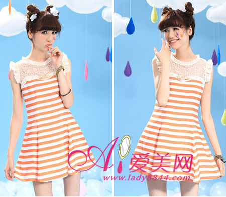 木耳边领口和袖口与梦幻的蕾丝融合更添甜美气息,下半身拼接的海军风条纹是整个设计的亮点,修身的A字裙版型完美修饰身材毫无缺陷哦!