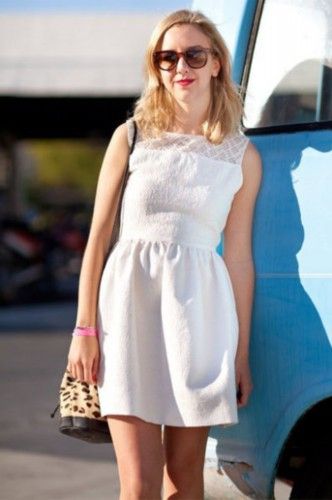 网纹拼接无袖白裙,款式凉爽清新,亚麻质地在夏季穿着吸汗透气非常合适。搭配豹纹包中和一些野性味道。