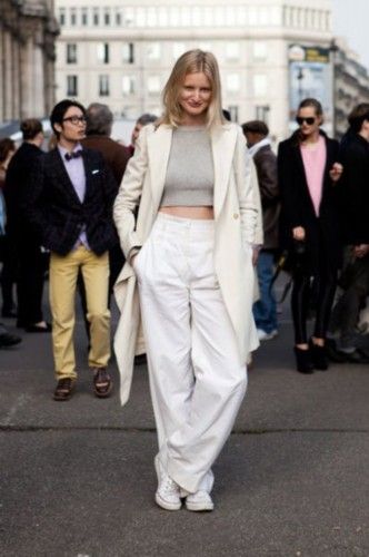 将白色衬衫与宽松的白色裤装搭配,搭配高跟鞋则优雅复古,搭配运动鞋则活力四射。