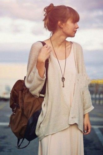 米白色的衣裙彰显女性气质,与长宽项链和双肩背包搭配,很有休闲范儿。