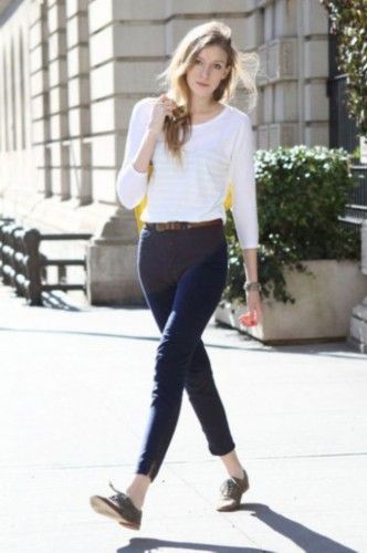 白色上装搭配深色系的长裤的装扮更适合上班一族,轻盈的白色有了黑色长裤的中和变得稳重起来。