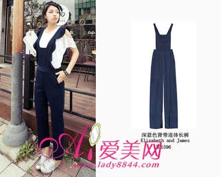 深蓝色的连体背带裤有种莫名的童趣感,搭配一件简单的百色T恤,非常的俏皮可爱,有种邻家小妹的感觉。
