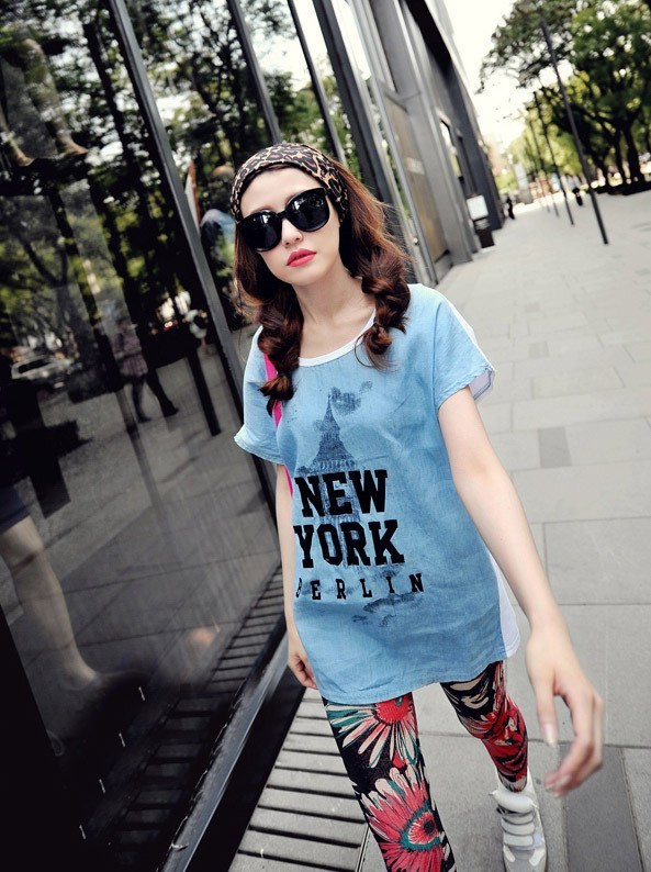 简洁的时尚装扮绝对让你的夏季与众不同!拼色字母铁塔修饰的长款tee作为上身搭配,可以和连衣裙有相同的效果,随意的搭配上拼色大花朵竖条纹修身打底裤,更加符合今年夏季的时尚魅力。