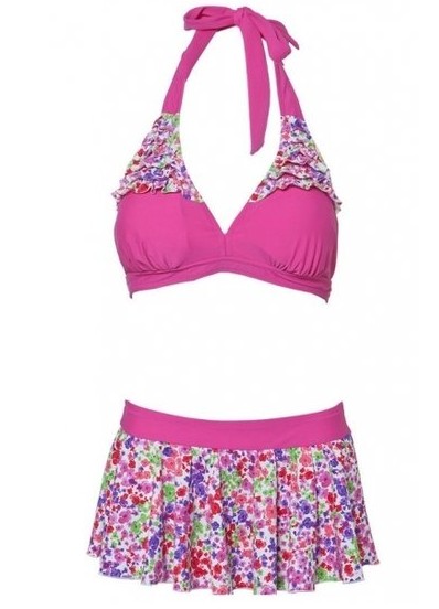 这款碎花比基尼套装,颜色鲜艳活泼,令女士们尽现婀娜多姿的优雅身段。