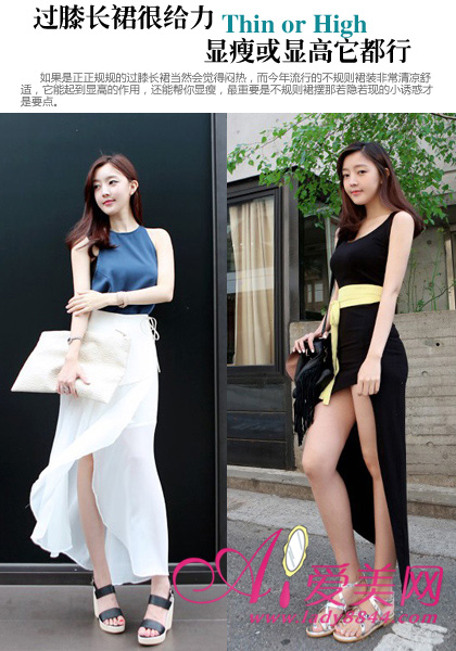 导语:如果是正正规规的过膝长裙当然会觉得闷热,而今年流行的不规则裙装非常清凉舒适,它能起到显高的作用,还能帮你显瘦,最重要是不规则裙摆那若隐若现的小诱惑才是要点。