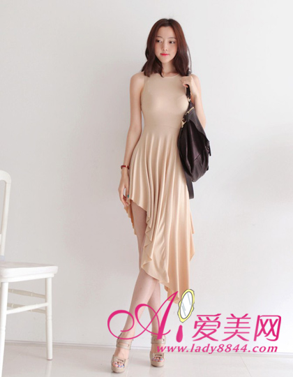 显瘦诀窍:背心不规则连衣裙,斜裙摆,美腿若隐若现