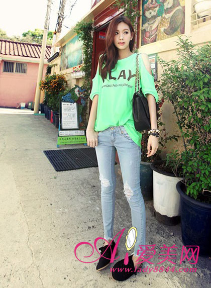 搭配tips:露肩T恤+牛仔裤,色彩夺目潮味十足