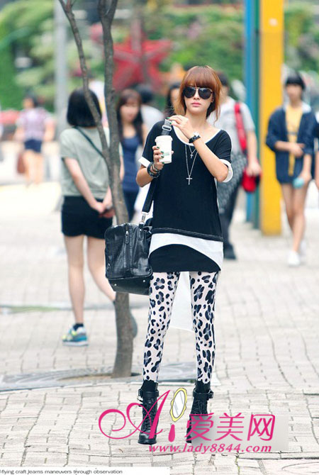 黑白撞色,简约短袖t恤,前短后长的造型个性十足,内搭长款吊带背心增加造型感,搭配豹纹打底裤,时髦有型。大圆领剪裁,演绎大气性感味道。