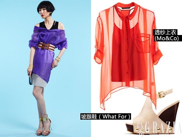 左图搭配:黑白耳环(Muara)新品未定价、紫色透明风衣(PennyBlack)RMB2,980、黑色针织背心(HaniiY)RMB2,380、白色镂空针织裙(System)RMB2,150、白色腰封(Stradivarius)RMB159、深蓝皮质手包(Miss sixty)RMB930、金色手镯(Muara)新品未定价、金色蛇纹高跟鞋(Stellaluna)RMB1,880