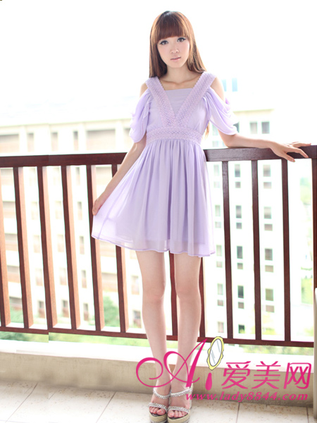 时尚Tips:气质紫色露肩雪纺连衣裙