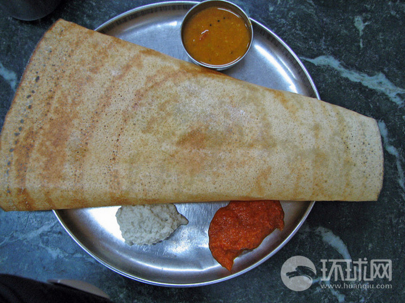 这种薄饼形如盘子,薄如纸张,通常由大米和扁豆制成。薄饼是在热的煎锅里烤制而成的,同时配有剁碎的熟土豆丁,炒制的洋葱粒和浓浓的蒜味酸辣酱,香味四溢,是印度南部一道著名的素食。