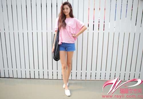 粉色五分袖宽松T搭配蓝色牛仔短裤和平底鞋
