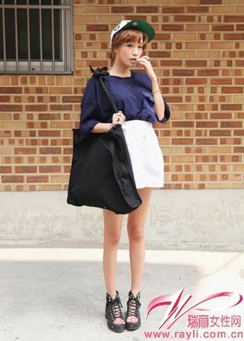 深蓝色五分袖宽松T搭配白色A字裙Mix棒球帽
