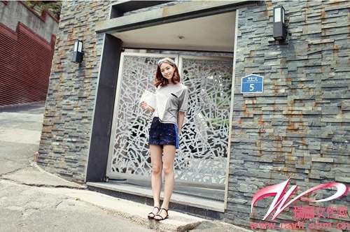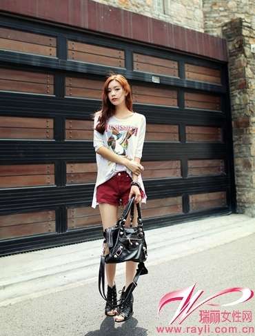 复古图案五分袖白色T搭配枣红色牛仔短裤