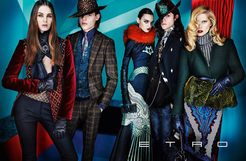 Etro(艾特罗)2012秋冬系列广告大片,由超模Iselin Steiro、Laura Love、Magda Laguinge、Miles McMillan、Ton Heukels共同演绎,摄影师Mario Testino掌镜。