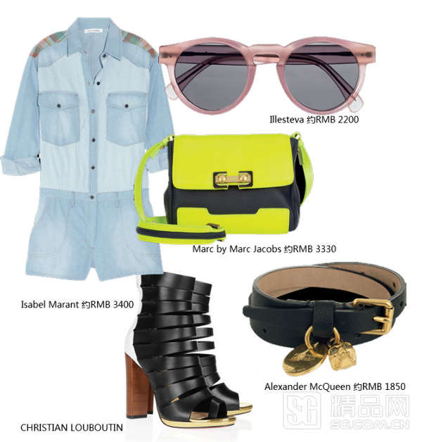 出挑的荧光黄长带包、金属质感粗跟鞋、摇滚感配饰、果冻色小圆镜共同把你打造成率性的街头酷女孩,这样的混搭look必定能得到Tommy Ton的青睐。浅色的丹宁布更适合夏日,肩部的细节充满民俗感觉。