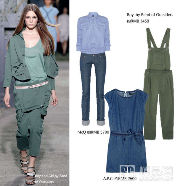 街头感十足的工装丹宁款想必是许多率性女孩的爱!别担心,设计师们在丹宁布中加入亚麻、莱卡等元素,让时装变得轻薄有弹性,更适合在夏日穿着。复古背带裤也在这一季得以复辟,还有McQ 看似两件的连身装也趣味十足。