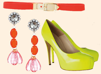 图注:Kate Spade的霓虹色皮带80英镑,“水果糖”的超大款亮粉色螺柱耳环,Manolo Blahnik高跟鞋440英镑