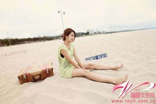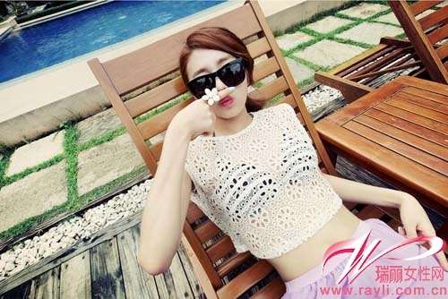 白色超短款编织上衣内搭比基尼,下身选择薰衣草色纱裙