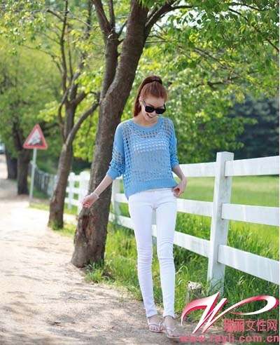 冰蓝色短款编织罩衫内搭白色吊带和同色紧腿裤