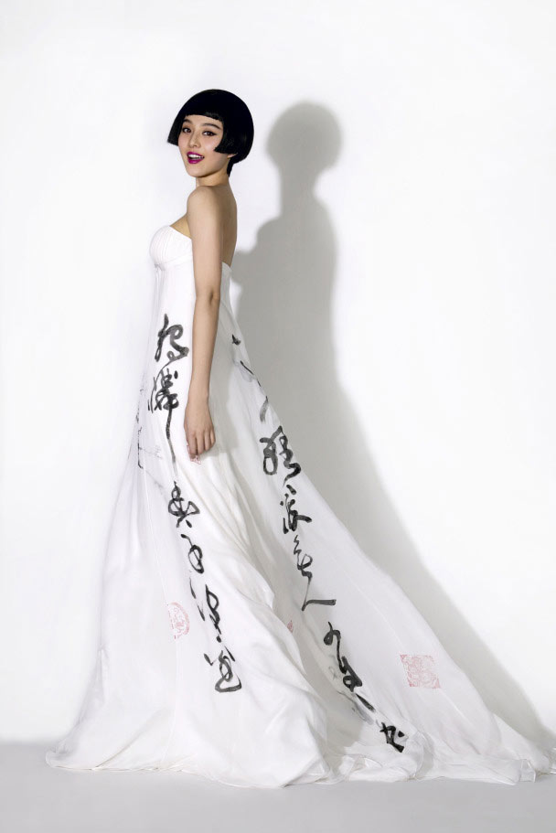 设计阐述:劳伦斯说:“当时柏林又冰天雪地,穿上白色的衣服,加上墨梅,这样太美了!这件衣服前面的纱是打开的,梅花是隐藏在纱的里面,飘动时有一种寻的感觉,写意的东西完全表现出来了。前面是抹胸裙,后面是帅气的书法、里面是梅花,全部混然天成。”范冰冰在红毯上用瀑布般的青丝配合它,让整体风格十分飘逸灵动。