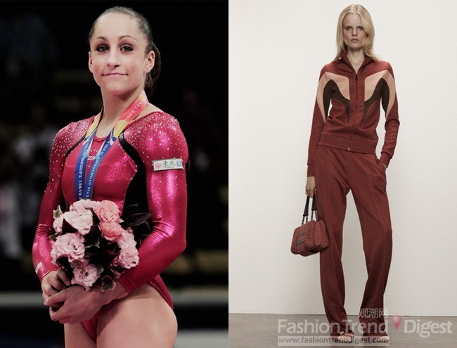 Wieber的得奖造型非常相似,设计师从反光感的红色紧身体操服吸取灵感,设计出这款修身的运动套装,同时融入不规则的拼色,让普通的运动装更具时尚感。